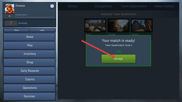 3、匹配成功后會彈出【Your match is ready】提示,需在倒計時結束前點擊【Accept】按鈕進入對局,超時未接受可能會失去本次匹配機會,需重新排隊。