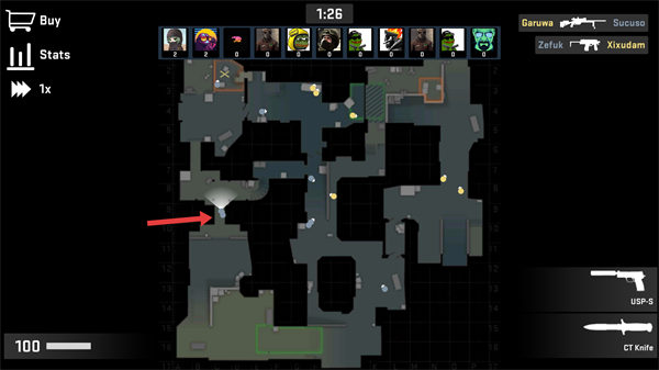 4、進入對局后,界面會顯示地圖布局、剩余時間及雙方裝備情況,可通過左側【Buy】功能購買武器,結合地圖點位規劃移動路線,利用地形優勢提升對戰勝率。