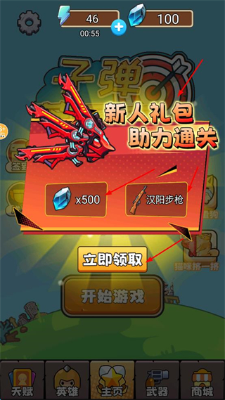 1、進入游戲先領新人禮包,獲取500水晶和漢陽步槍,提升初始戰力,助力闖關。