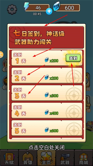 2、參與七日簽到,每日點擊簽到領水晶,累計獲取神話級武器,強化裝備。