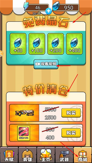 4、逛商城看免費晶石,看視頻獲?。魂P注特價清倉,按需購買武器、道具增強實力。