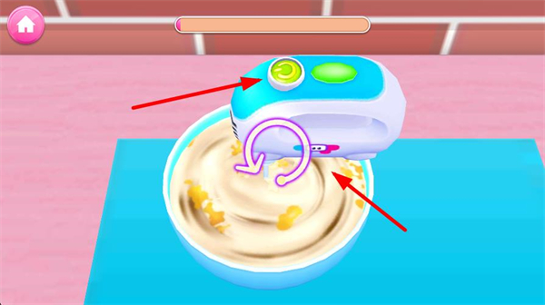 2、點擊攪拌器上的綠色按鈕,按界面提示的旋轉方向操作攪拌器,將碗內的食材充分攪拌均勻。