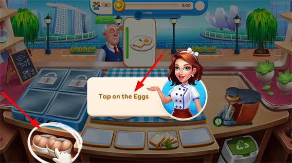 1、看到界面提示點擊雞蛋,按照指引點擊擺放好的雞蛋,開啟早餐制作的第一步操作,準備處理食材。