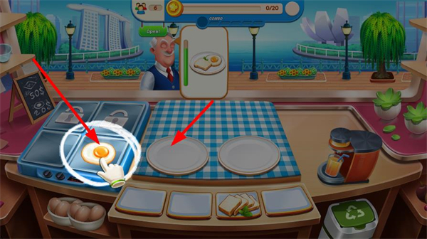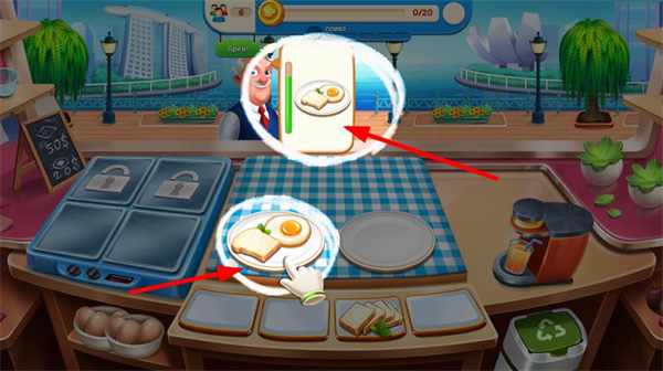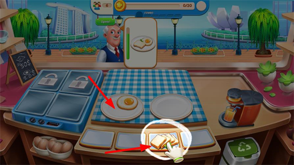 4、把吐司和雞蛋按提示組合好,將成品拖給顧客,完成這份早餐的制作,推進游戲進程。