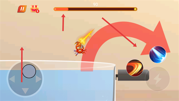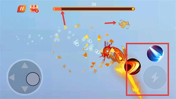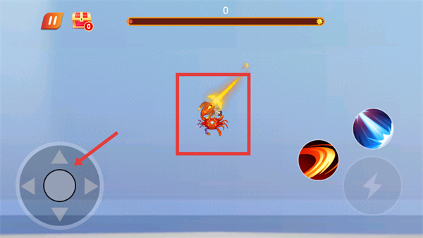1、進入游戲界面后,通過左側方向輪盤控制螃蟹移動,調整位置靠近目標,同時可觀察右上角技能按鈕,準備釋放技能提升戰斗效率。