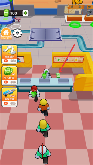 4、將加工完成的物品交付至對應柜臺,與排隊角色完成交互,交付后可獲取對應收益,同時可解鎖后續的升級、解鎖新道具等功能。