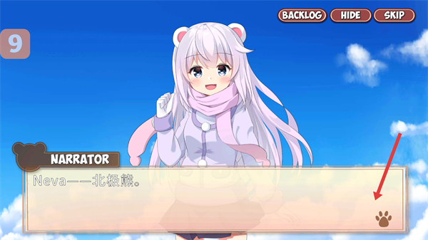 2、查看角色介紹界面的文本信息,此處展示的是北極熊形象的Neva,不同角色對應不同技能特性,了解角色設定有助于后續戰斗中的陣容搭配,點擊界面可推進劇情。