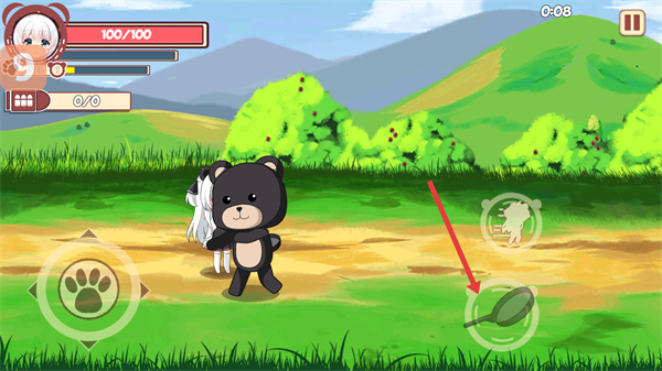 4、當黑熊敵人出現時,點擊右側武器按鈕切換裝備,初始武器可對黑熊造成基礎傷害,需保持攻擊節奏并結合走位躲避敵人近身攻擊,以此推進戰斗進程。