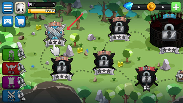1、在關卡選擇界面點擊已解鎖的1關圖標,關卡按順序逐步開放,1關是初始挑戰關卡,通關后可解鎖2關并獲取基礎資源,界面左側還有部落、神器等功能入口,后續可逐步解鎖。