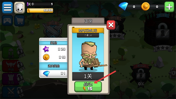2、點擊戰斗按鈕進入1關挑戰,該界面顯示關卡獎勵與敵方角色屬性,消耗15點體力即可開啟戰斗,體力會隨時間恢復,優先挑戰已解鎖關卡可快速積累經驗與金幣。