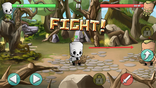 3、進入戰斗場景后,通過底部按鈕操控角色移動與攻擊,界面顯示雙方生命值,需通過走位躲避敵方攻擊、使用武器輸出,連擊數越高戰斗收益越高,需保持攻擊節奏推進戰斗。