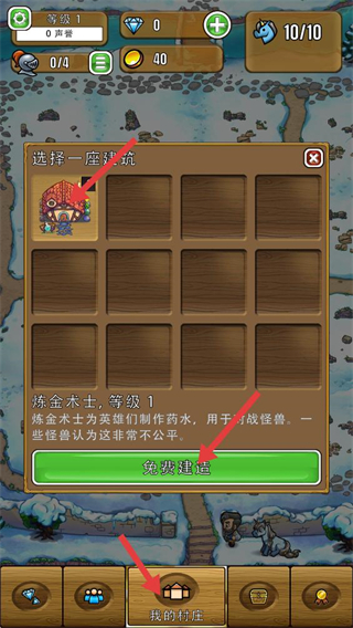 2、在建筑選擇界面中選定煉金術士建筑,查看其功能說明后點擊免費建造按鈕,即可完成該建筑的搭建,該建筑可用于為英雄制作藥水。