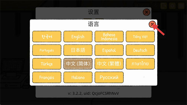 4、選擇中文簡體語言選項后,點擊關閉按鈕返回設置界面,即可完成語言切換,使游戲內容以簡體中文呈現,提升游玩的適配性。