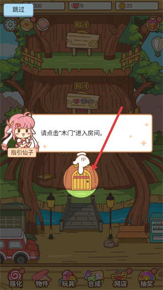 1、界面中會有指引仙子提示操作,按照提示點擊木門即可進入房間,過程中可留意頂部的愛心、金幣等資源顯示,底部功能欄包含強化、合成等選項,后續可按需使用。