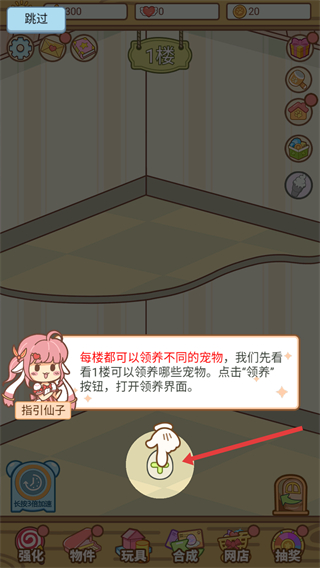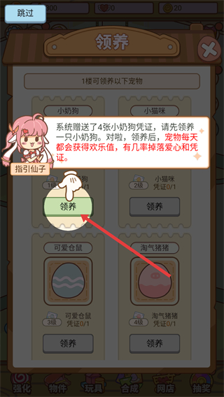 2、進入房間后,不同樓層可領養不同寵物,1樓對應特定寵物類型,按照指引點擊領養按鈕,即可打開領養界面,后續各樓層領養操作可參照此步驟進行。