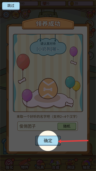 4、領養成功后會彈出命名界面,需為寵物取個名字,也可點擊隨機按鈕生成名稱,確認后點擊確定即可完成寵物領養的全部流程,后續可在房間內查看寵物狀態。