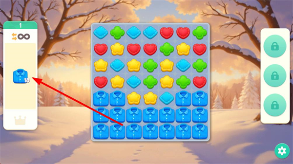 1、進入游戲關卡,左側顯示收集目標為襯衫需收集18個,主界面分布著心形、星形、襯衫等消除元素,可通過消除對應元素推進收集進度。