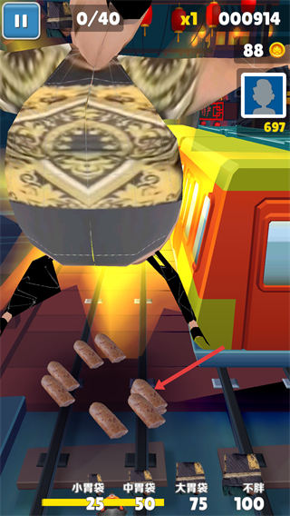 2、進入賽道后,角色將自動前進,需通過操作躲避軌道上的障礙,界面頂部顯示進度與分數,底部有不同胃袋的容量標識,需控制角色移動以完成進度目標。