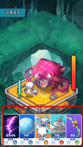 4、持續使用技能攻擊后續出現的章魚型怪物,累計傷害直到其血量清空,完成該引導關卡的戰斗,順利通關進入下一個環節。
