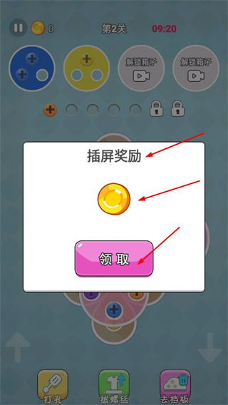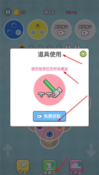 3、使用拔螺絲道具,依據清空等候區螺絲功能,看廣告免費獲取,清理阻礙提升消除效率。