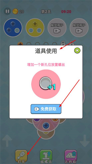 2、點擊打孔道具,看增加新孔位說明,通過免費獲取看廣告解鎖,添加孔位放螺絲。