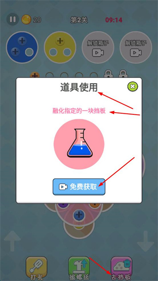 4、選去擋板道具,了解融化指定擋板作用,看廣告免費獲取,消除障礙推進關卡進度。
