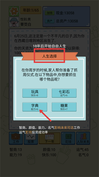 2、周歲時會觸發抓周選擇,若想提升智力相關屬性,可選擇字典選項,該選項能直接增加能力值,助力后續屬性成長。