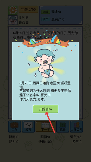 1、進入游戲后先確認自身初始信息,天資顯示為奇才,此時點擊開始奮斗按鈕,即可開啟人生進程,后續可逐步提升各項屬性。