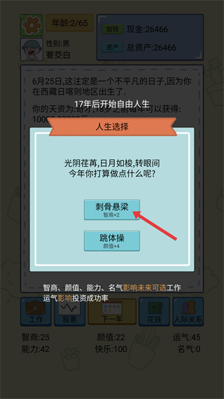 3、后續每年會出現人生選擇,若目標是加智力,可選擇如刺骨懸梁選項,此選項能直接提升智商屬性,可以積累智力優勢。