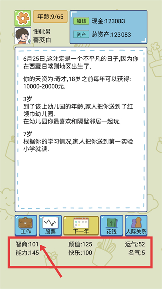 4、成長過程中隨著年齡增長會自動進入教育階段,持續選擇提升智力的選項后,可看到智商屬性逐步增長,隨時能夠掌握自身智力點情況。