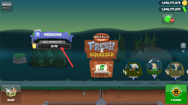 1、進入主界面后先查看任務進度,當前目標是售出10個產品,點擊右側FOUND按鈕,即可進入捕捉怪物的準備場景,同時可利用商店籌備物資。