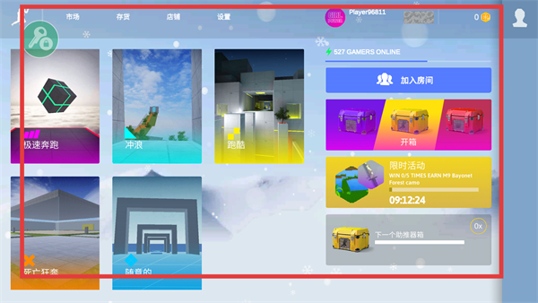 1、進入主界面后可看到多種游戲模式選項,選擇極速奔跑模式,同時可通過右側加入房間按鈕進入聯機場景,也能利用開箱功能獲取道具助力游戲。