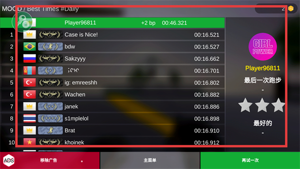 4、關卡結束后會顯示排行榜及個人成績,可查看當前排名與最佳記錄,若對成績不滿意,點擊再試一次按鈕可重新挑戰關卡。