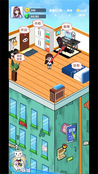 4、擁有獨立的外部商城系統,服裝、電子設備、家具等道具需解鎖后前往特定商店購買。高品質設備能顯著提升直播效果與屬性加成。