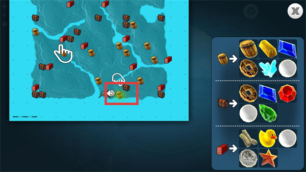 3、資源地圖界面顯示各類物品位置,右側是物品兌換列表,點擊地圖上的物品圖標,可定位對應資源,按提示收集指定物品,用于后續兌換所需道具。