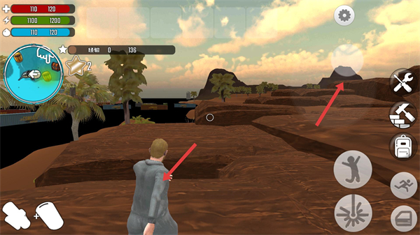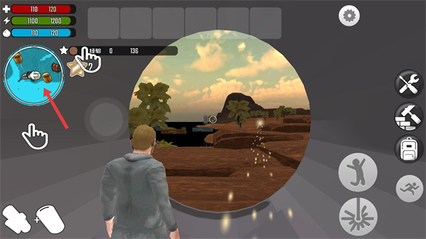 2、進入游戲后操控角色,界面左側有資源圖標,頂部顯示屬性數值,右側有工具按鈕,需點擊左側資源圖標,打開資源地圖界面,查看可收集的物品分布。