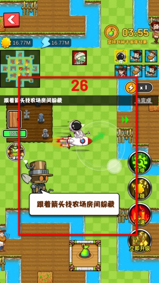 1、跟著箭頭指引移動角色,找到農場房間進行躲藏,同時要留意界面顯示的倒計時,堅持到種子發芽結果是通關的關鍵目標之一。