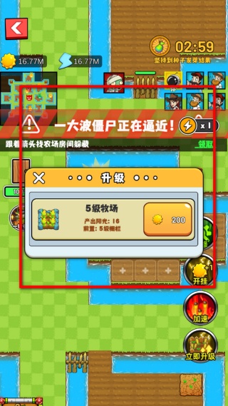 2、當提示有僵尸逼近時,可打開升級界面,消耗對應資源升級牧場,升級后的牧場能提升產出,還能前置解鎖更高等級的柵欄。
