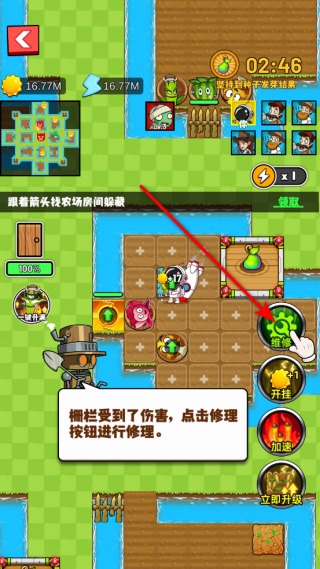 3、柵欄受到傷害后,點擊修理按鈕對其進行修復,保持柵欄的完好能更好抵御僵尸進攻,同時也能為后續的種植和建設提供保障。