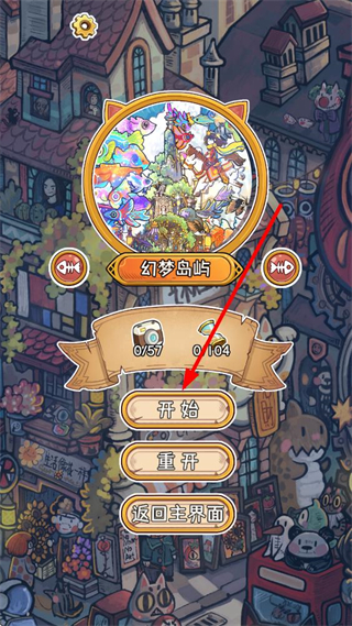 1、進入游戲看到幻夢島嶼界面,能看到收集進度的顯示,界面有開始重開返回主界面按鈕,選擇開始即可開啟游戲。