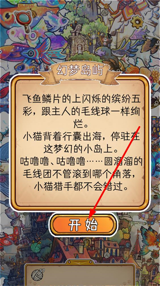 2、看到幻夢島嶼的劇情文本介紹,知曉小貓出海駐島的相關設定,點擊界面上的開始按鈕,繼續推進游戲流程。