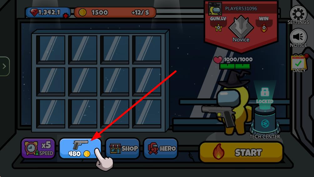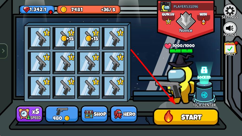 1、進入游戲界面后,可消耗金幣點擊手槍按鈕獲取槍械,界面上方顯示鉆石、金幣等資源,還有速度道具可輔助,準備好后可開啟對局。
