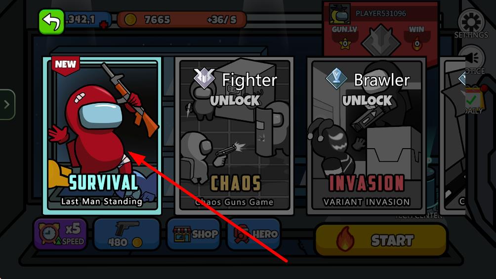 3、點擊角色相關界面,可選擇SURVIVAL等不同模式,部分模式需解鎖,選定模式后即可進入對應的對局場景。