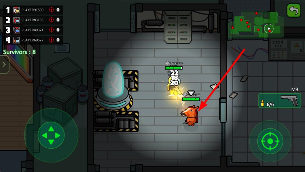 4、進入對局后,通過移動按鈕操控角色移動,點擊攻擊按鈕用槍械攻擊其他玩家,界面顯示存活人數,需擊敗對手成為最后幸存者。