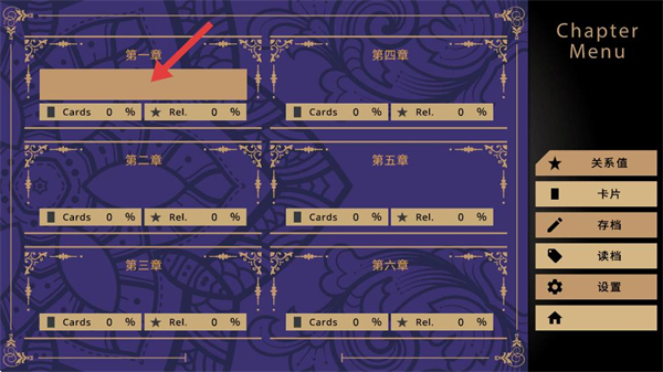 2、在章節菜單頁面,可選擇第一章至第六章的游戲章節,同時顯示各章節的卡片收集進度與關系值進度,右側提供存檔、讀檔等功能選項。