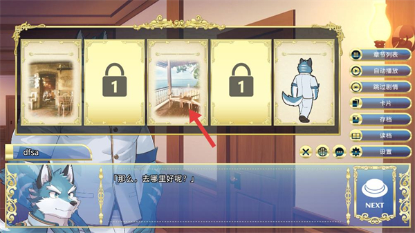 3、進入游戲劇情界面,可選擇不同的場景選項推進劇情,部分選項處于鎖定狀態需解鎖,右側設章節列表、自動播放等功能,點擊NEXT可推進對話。