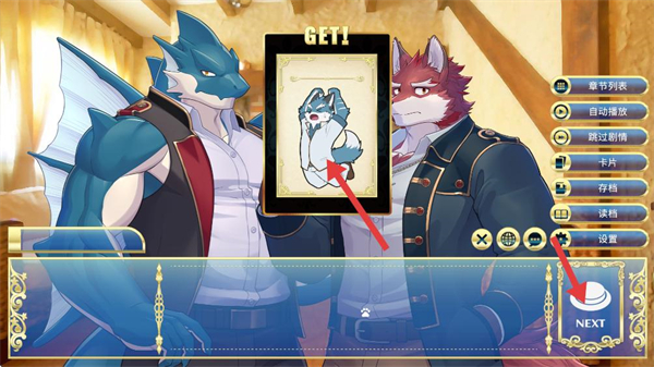 4、游戲過程中會獲得角色卡片,彈出GET提示框展示獲取的卡片,點擊NEXT可繼續推進劇情,收集卡片是游戲的核心玩法之一。