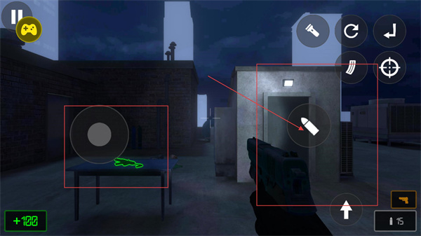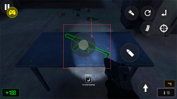 1、場景中可通過右側彈藥按鈕補充子彈,同時留意桌上的熒光道具,這類道具可能是資源收集目標,需靠近互動獲取。