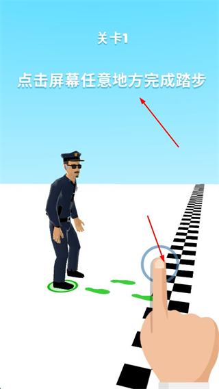 1、點擊開始按鈕進入游戲,點擊屏幕任意處完成踏步,跟隨指引讓角色沿黑白路徑前進。