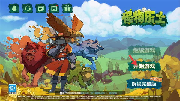 1、進入游戲主界面,可選擇開始游戲開啟新進程,或繼續游戲加載存檔,還能解鎖完整版獲取更多內容,界面風格偏向奇幻冒險題材。